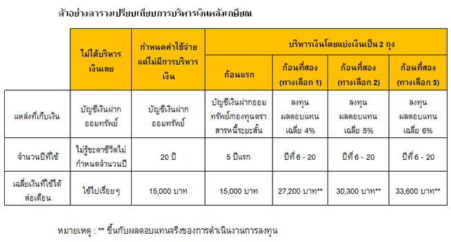 โดยก้อนแรกสำหรับสภาพคล่อง ใช้ในชีวิตประจำวันและค่ารักษาพยาบาล เงินก้อนนี้ให้เก็บในบัญชีเงินฝากหรือกองทุนตราสารหนี้ระยะสั้น อาจแบ่งเงินไว้ในบัญชีเงินฝากออมทรัพย์สำหรับค่าใช้จ่าย 1 ปี (180,000 บาท) และกองทุนตราสารหนี้ระยะสั้นสำหรับค่าใช้จ่ายอีก 4 ปีข้างหน้า (720,000 บาท)