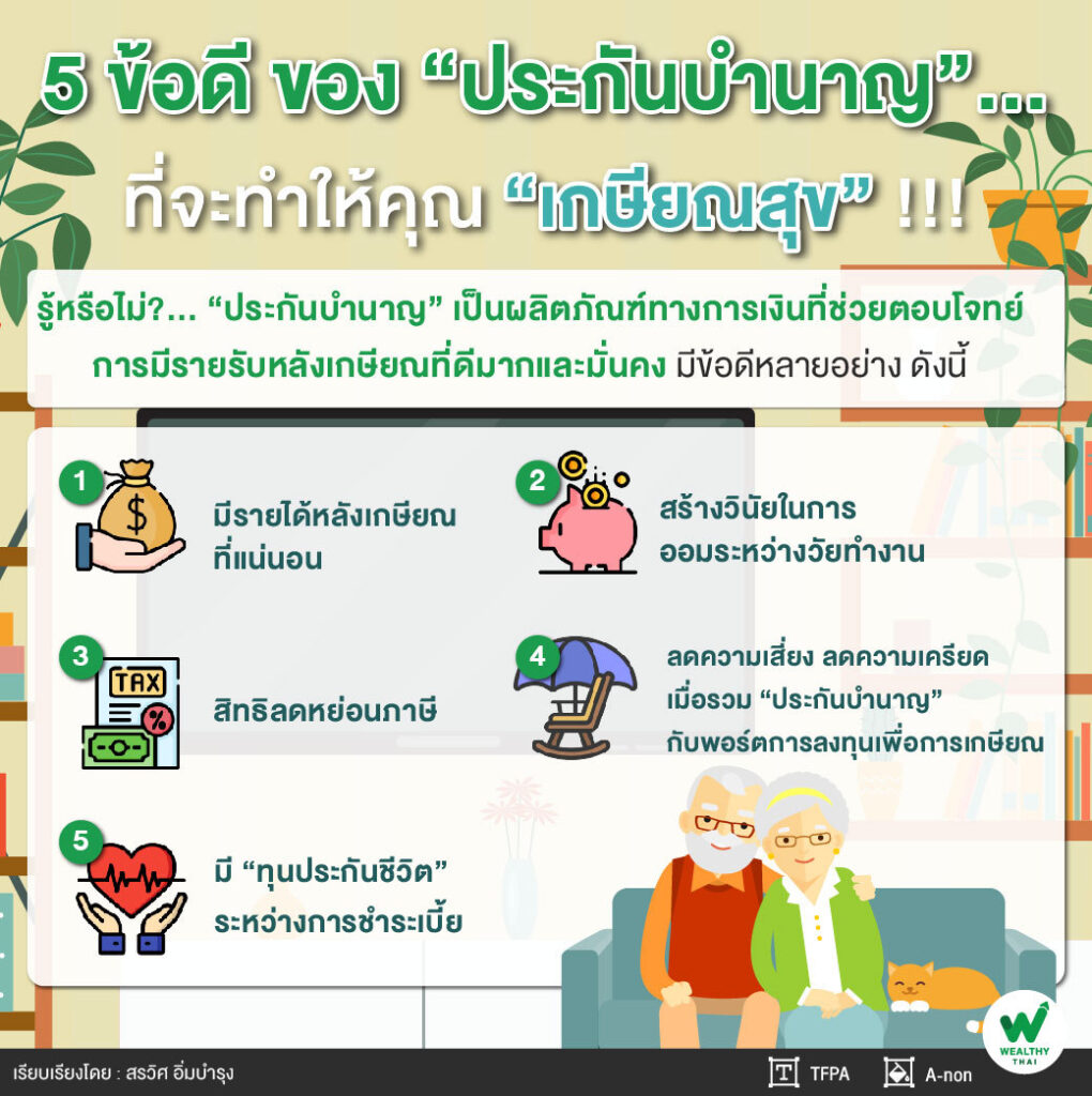 “ดังนั้น จากผลประโยชน์ที่กล่าวมาข้างต้น จะเห็นได้ว่าการวางแผนเกษียณที่รวมกับ ‘ประกันบำนาญ’ มีประโยชน์อย่างมาก จึงนับว่าเป็นสินค้าทางเงินหลักที่ตอบโจทย์ทั้งตัวผู้วางแผนเกษียณและครอบครัวให้ได้รับความสุขหลังเกษียณได้เป็นอย่างดี”